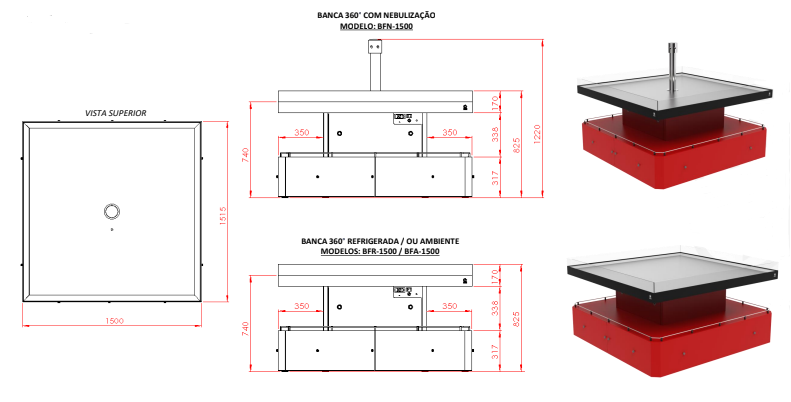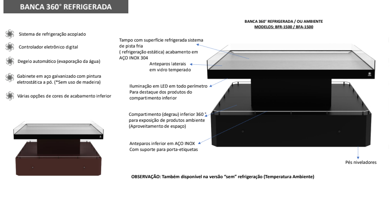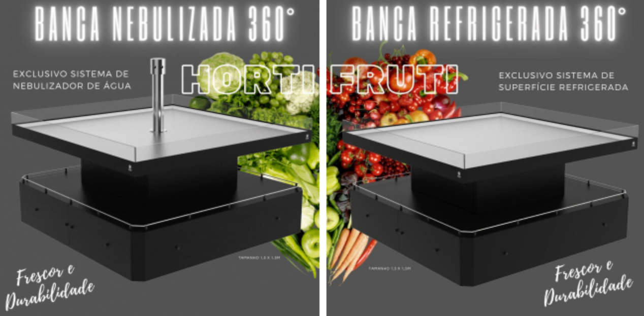 A banca nebulizada para hortifruti com sistema de nebulização italiano mantém a umidade ideal sem formar gotículas, garantindo frescor, melhor conservação e excelente apresentação dos produtos. Conta com estrutura em aço galvanizado, inox 304, vidros temperados, iluminação LED perimetral, compartimento inferior 360°, sensor de nível de água em LED e opção de reservatório interno, oferecendo durabilidade, higiene e redução de perdas.