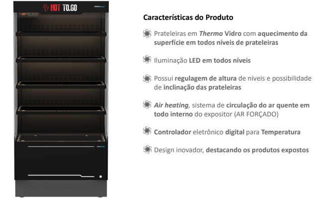 Com sistema Air Heating (ar forçado), o calor circula de forma eficiente por todo o interior do expositor, assegurando temperatura constante em todos os níveis. O controlador eletrônico digital possibilita ajustes precisos, enquanto o design inovador e verticalizado valoriza os produtos expostos e otimiza o espaço no ponto de venda.