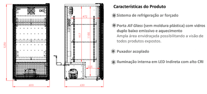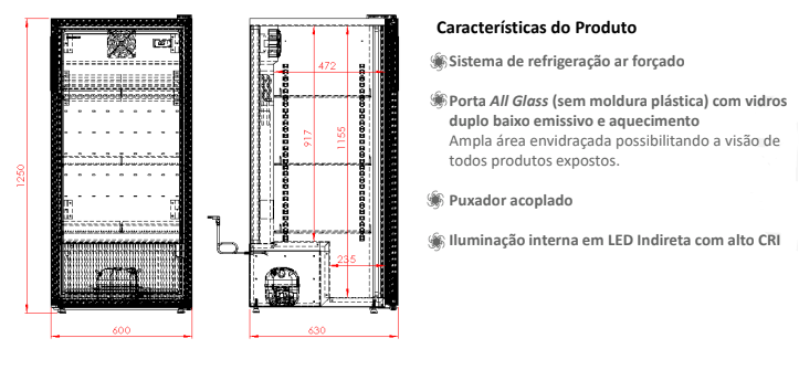 Alta performance de refrigeração, com sistema de ar forçado que garante temperatura uniforme e melhor conservação dos produtos.